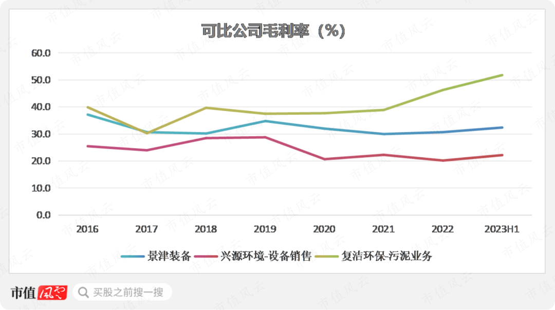 结合可比公司同类业务毛利率来看,公司高于兴源环境,但明显低于复洁环保。