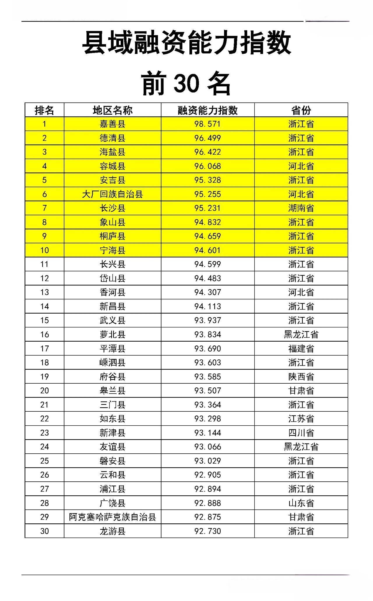 县域经济能否高质量发展,与其所在区域的产业经济发展是否平衡、资源分配是否均衡密切相关,既看发展成效,也看可兑现的潜力。抛开发展势头更为迅猛的县级市,纵览县域融资能力30强,发展更为均衡的经济大省浙江占据了17个席位,遥遥领先。其他入选的县大多凭借特色产业或优越区位占据一席之地,尤其以黑龙江鹤岗的萝北县、福建福州的平潭县等极具代表性。