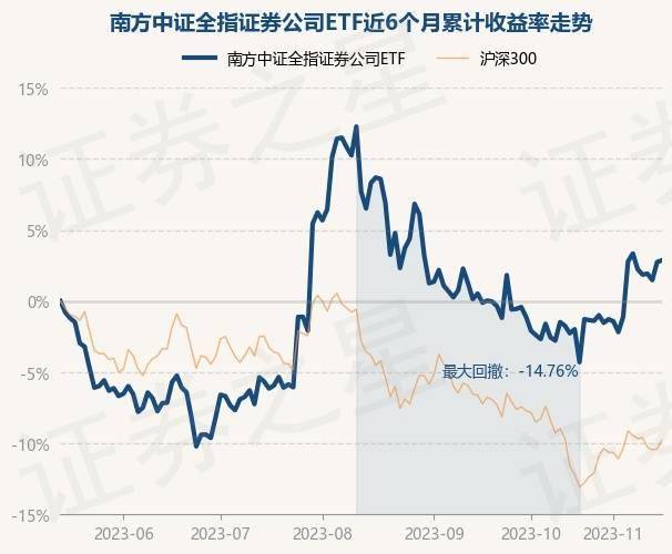 证券之星消息,11月15日,南方中证全指证券公司ETF最新单位净值为0.9769元,累计净值为0.9769元,较前一交易日上涨0.12%。历史数据显示该基金近1个月上涨5.54%,近3个月下跌5.03%,近6个月上涨2.87%,近1年上涨8.4%。该基金近6个月的累计收益率走势如下图: