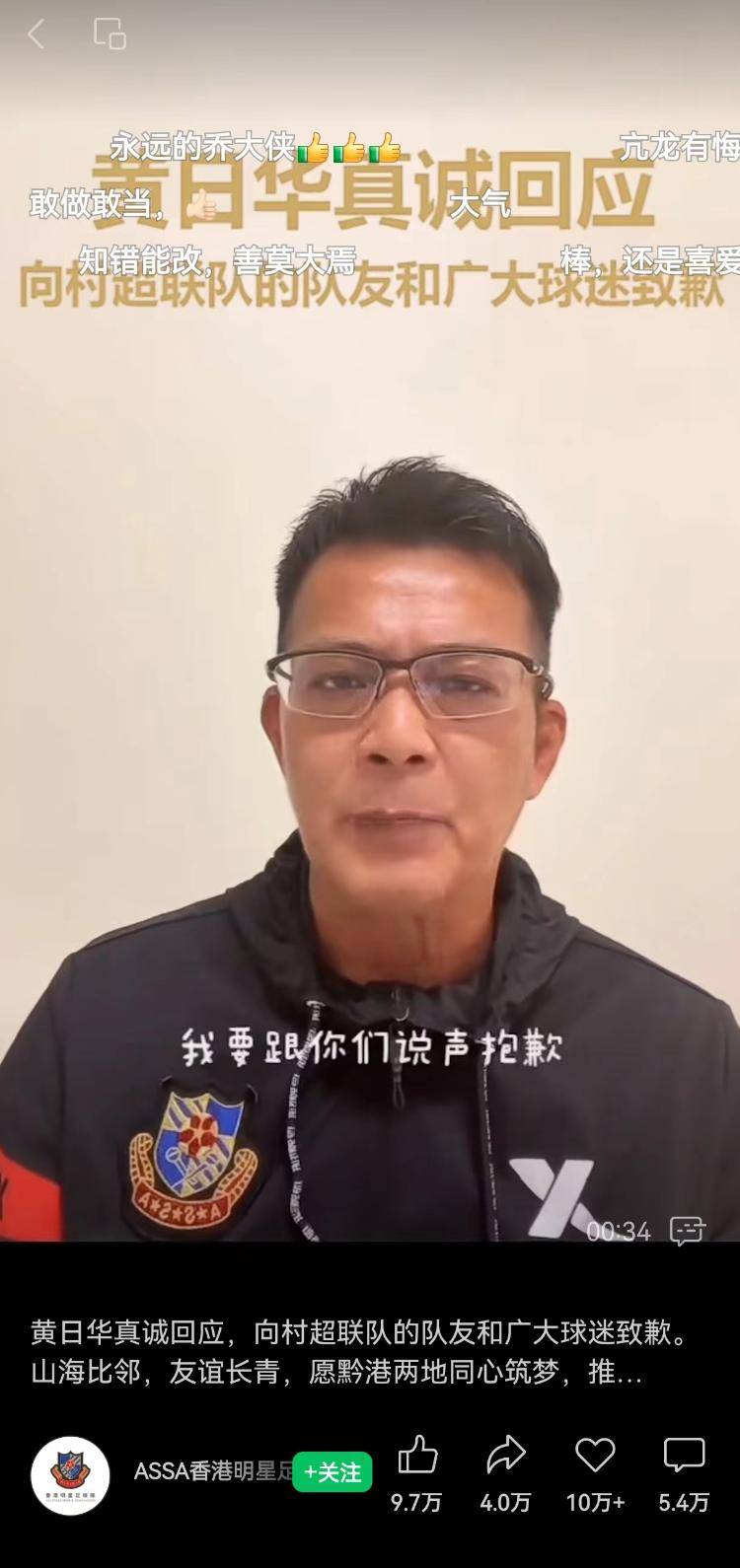 黄日华说:“这几天我看过好多视频,也看过所有网友对我的批评,我都全部一一接受。因为经过自我反省之后,我觉得我在控制情绪方面真的做得不好,还有很多需要改善的空间。在这里,我觉得我是做错了。所以,在这里我要跟所有村超联队的球员们、贵州的朋友、全国的球迷、所有的网友,我要跟你们说声抱歉!对不起,我错了,对不起。”