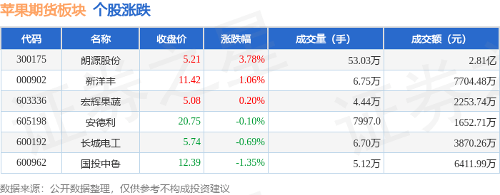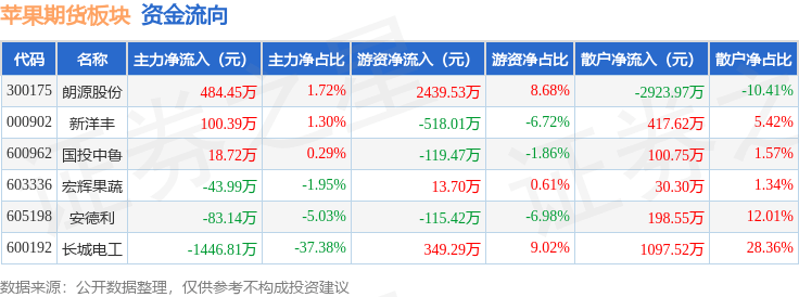 北向资金方面,当日苹果期货板块北向资金持股市值为1.24亿元,减持1.45万元。其中增持最多的是安德利,增持了126.07万元。减持持最多的是新洋丰,减持了127.52万元。苹果期货板块北向资金持股变动明细见下表: