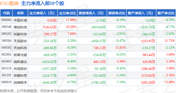 从资金流向上来看,当日F5G板块主力资金净流入1.03亿元,游资资金净流出1.89亿元,散户资金净流入8656.55万元。F5G板块个股资金流向见下表: