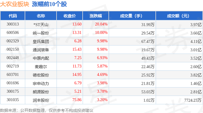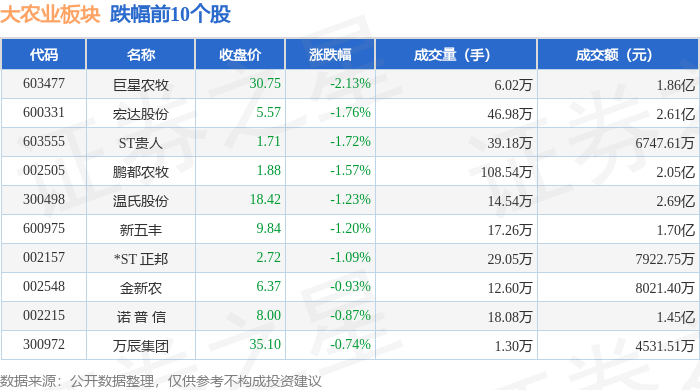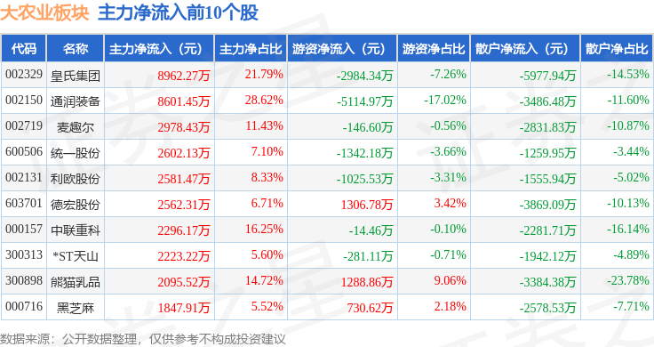 从资金流向上来看,当日大农业板块主力资金净流出1.06亿元,游资资金净流出2790.38万元,散户资金净流入1.34亿元。大农业板块个股资金流向见下表: