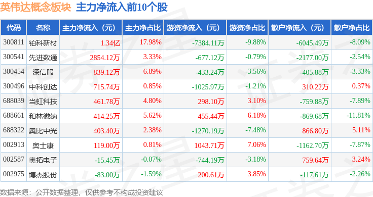 从资金流向上来看,当日英伟达概念板块主力资金净流出6.41亿元,游资资金净流入4583.72万元,散户资金净流入5.95亿元。英伟达概念板块个股资金流向见下表: