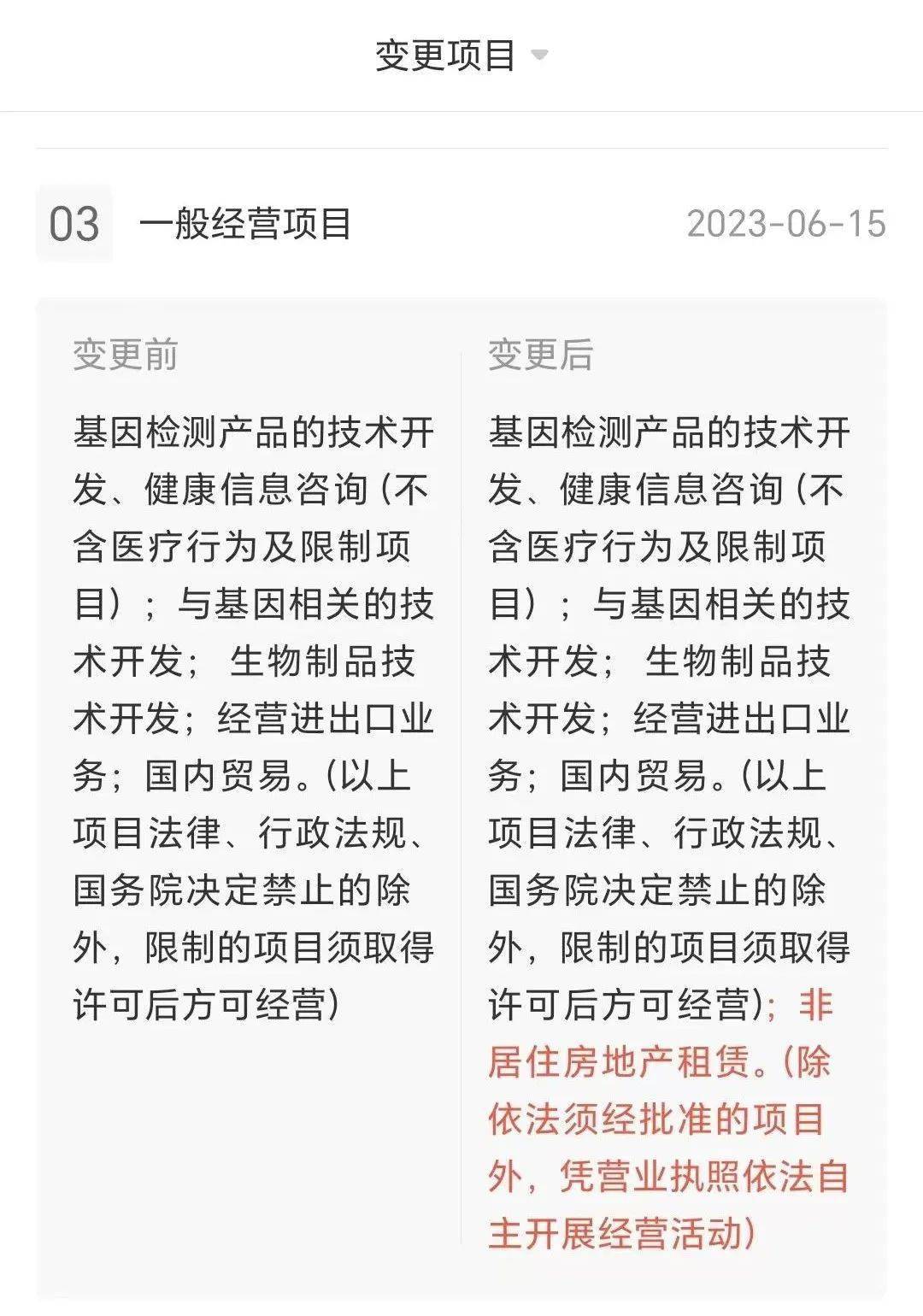 6月15日,深圳市核子基因科技有限公司(下称“核子基因”)发生工商变更,在经营项目中,新增了“非居住房地产租赁”业务。