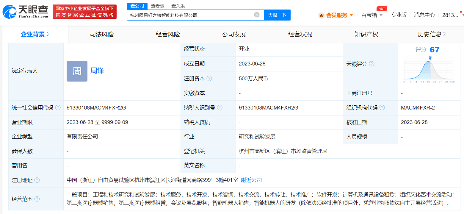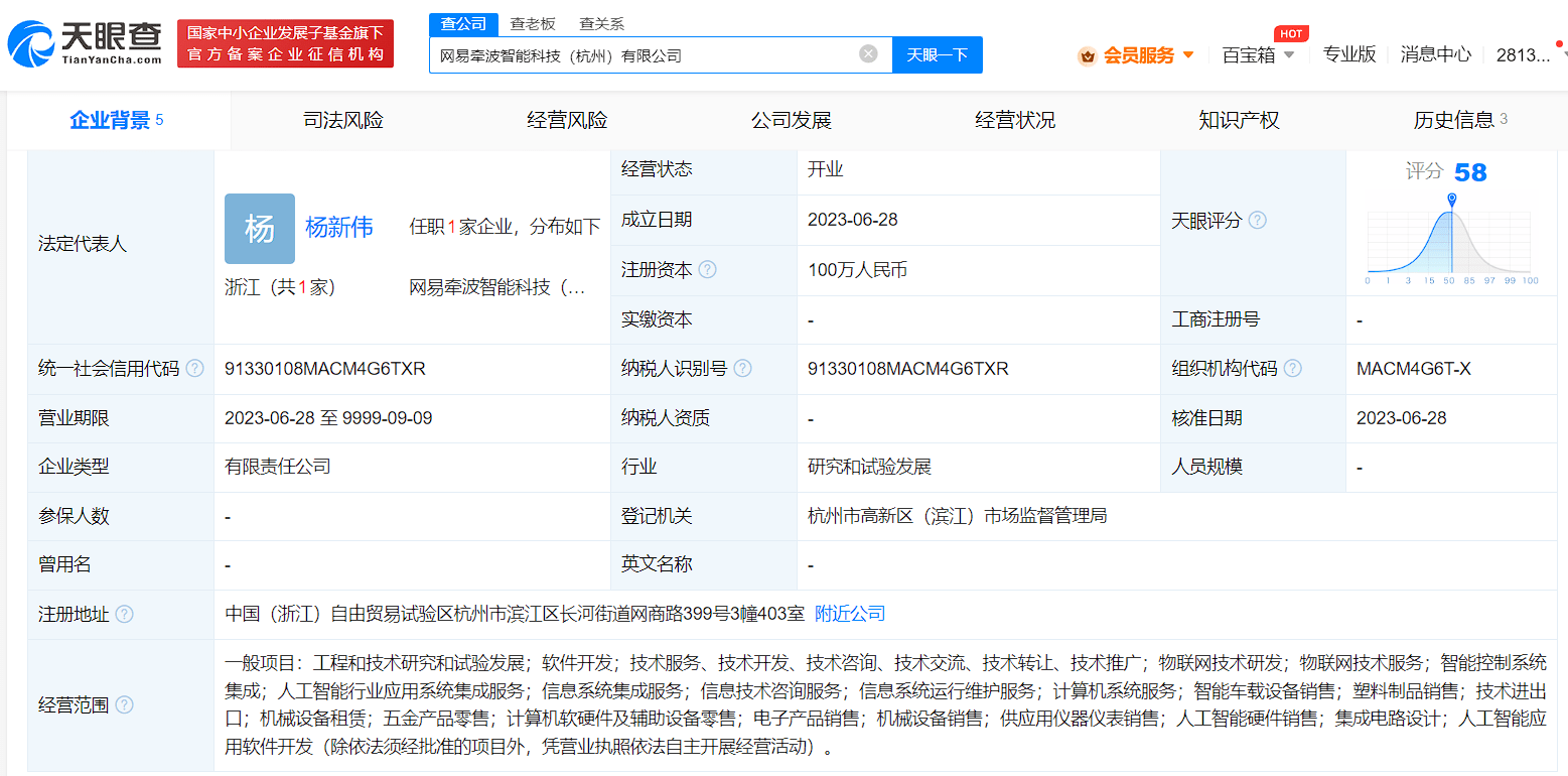 天眼查App显示,近日,杭州网易轩之辕智能科技有限公司、网易牵波智能科技(杭州)有限公司成立,注册资本分别为500万人民币、100万人民币,法定代表人分别为周锋、杨新伟。