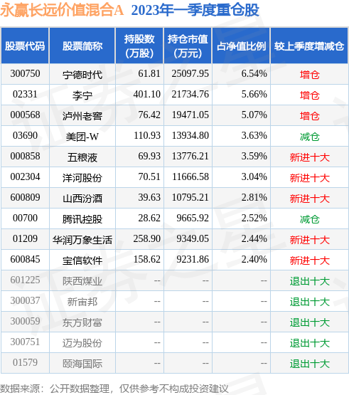 永赢长远价值混合A的前十大重仓股如下: