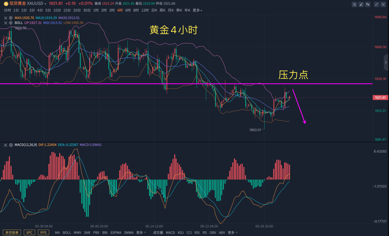 如图,周一盘中金价受数据影响,快速在美盘拉升至1931美元/盎司的高点位置,差一点就冲过了1935-37区域的压力位,主要还是在日线BOLL线中轨附近徘徊,而周线是处于5周线的压力点,还是偏弱的震荡,虽然现在反弹很强,但也是最后一枪药,继续以1935-38的区域为压力点持有空即可。