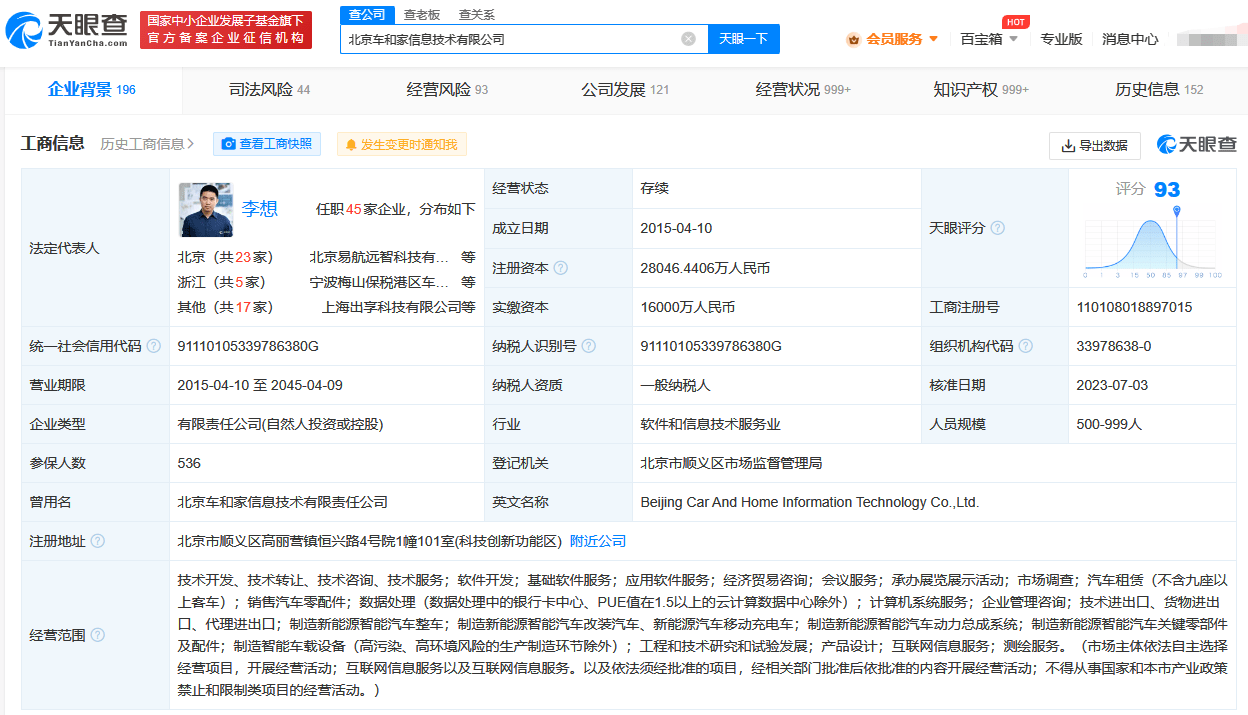 天眼查App显示,北京车和家信息技术有限公司成立于2015年4月,法定代表人为李想,经营范围含技术开发、销售汽车零配件、制造新能源智能汽车整车、工程和技术研究和试验发展等。目前,该公司由李想与李铁共同持股。