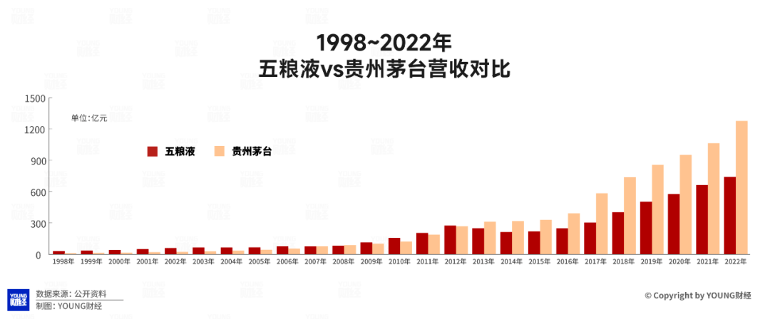 1998年-2022年,五粮液和贵州茅台营收对比图(可点击上方图片放大查看)制图/YOUNG财经
