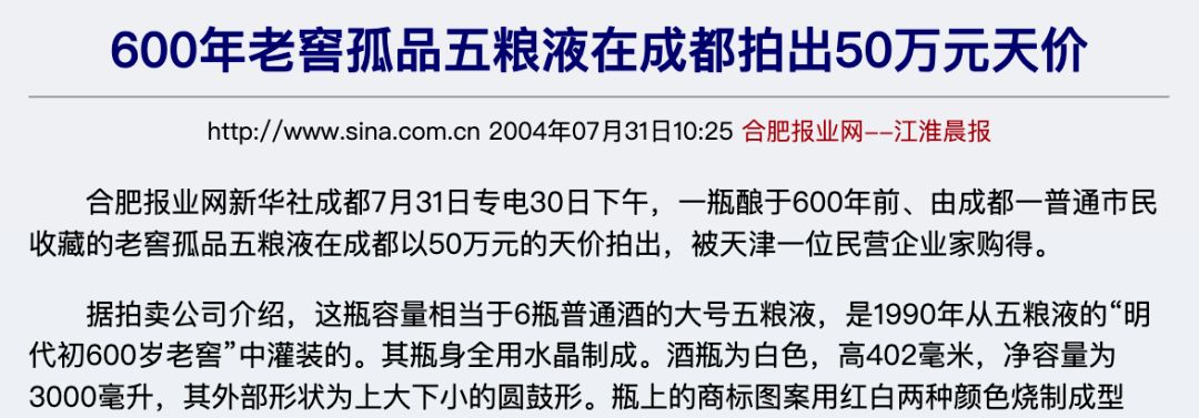 600年五粮液拍出50万元天价新闻报道的截图 图自/新浪