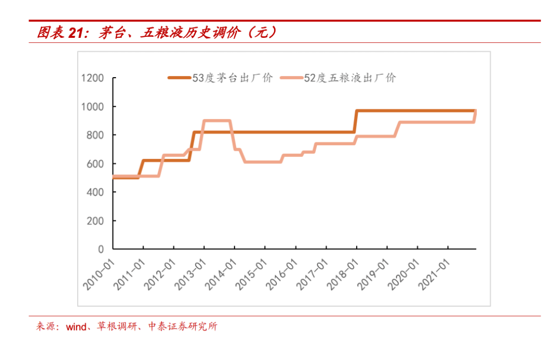 2000年-2008年,五粮液占领着白酒高端市场的定价权;随着茅台后来居上,定价权移交,五粮液开始对茅台采取价格追随策略,开始频繁调价。据中泰证券统计,过去12年五粮液调价次数高于茅台。