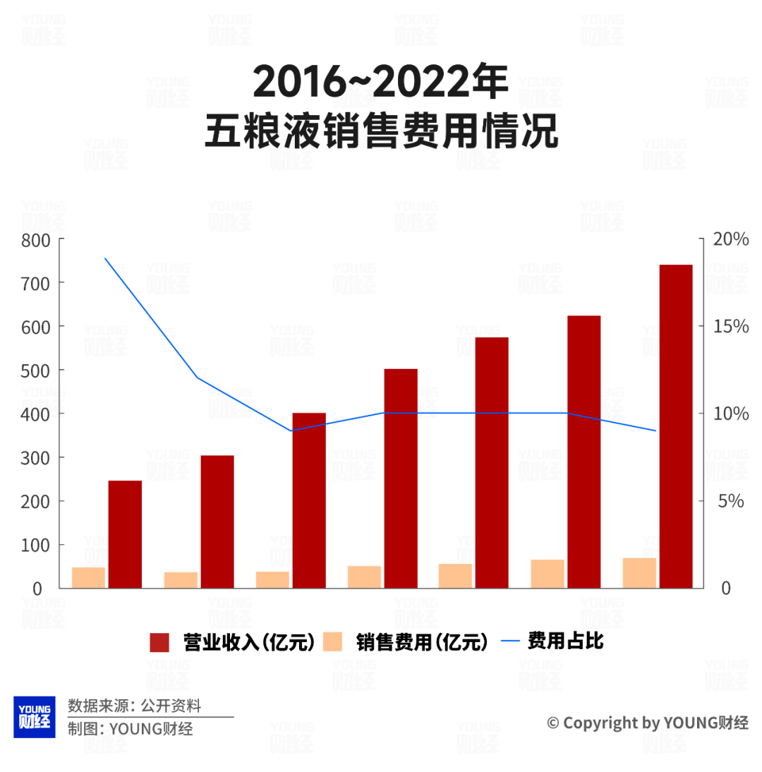 五粮液的销售费用(包括包括形象宣传费、促销费、仓储费等)呈现逐年上升的趋势,但其占据营收比例逐年减少,说明其营销转换的效能逐年增强了。作为对比,古井贡酒、泸州老窖、老白干酒等酒企的销售费用占据营收比例维持在25%之上。