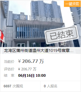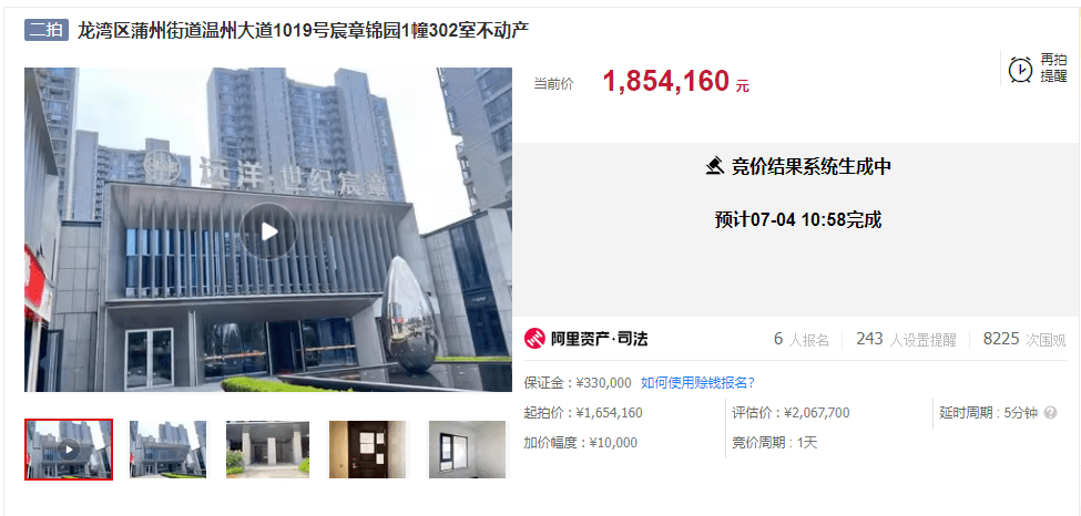 该房源起拍价约165万元,起拍单价约1.59万元/㎡,评估价约207万元。截至7月4日10时45分,共吸引超8000次围观,有6人报名参与拍卖,在倒计时只剩10分钟时,纷纷出手竞拍。