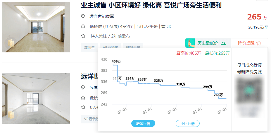 其中,低楼层房源的挂牌价在2万-2.68万元/㎡之间。一套131方房源的价格堪比“跳楼价”,一年内直降141万,总价从406万元跌落至265万元,折合单价约2万元/㎡,目前已有14人关注该房源,但暂未成交。