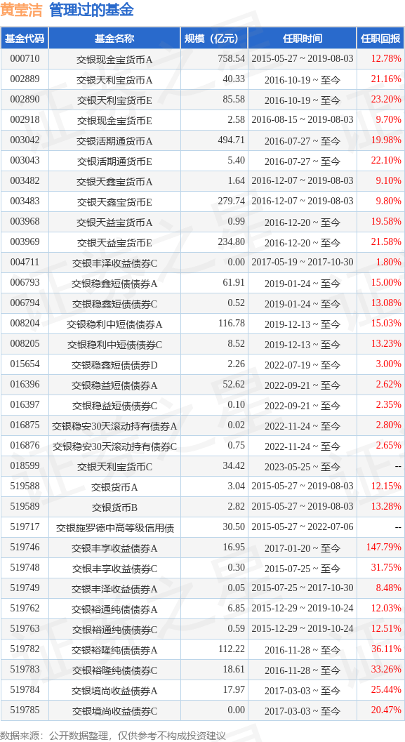 黄莹洁女士:基金经理。香港大学工商管理硕士、北京大学经济学、管理学双学士。2008年2月至2012年5月任中海基金管理有限公司交易员。2012年加入交银施罗德基金管理有限公司,曾任中央交易室交易员。2015年7月25日至2018年3月18日担任交银施罗德丰泽收益债券型证券投资基金基金经理,2015年5月27日至2019年8月2日担任交银施罗德货币市场证券投资基金基金经理,2015年5月27日至2019年8月2日担任交银施罗德现金宝货币市场基金基金经理,2016年12月7日至2019年8月2日担任交银施罗德天鑫宝货币市场基金基金经理,2015年12月29日至2019年10月23日担任交银施罗德裕通纯债债券型证券投资基金基金经理。2015年5月27日起担任交银施罗德理财21天债券型证券投资基金基金经理至今,2015年7月25日起担任交银施罗德丰享收益债券型证券投资基金基金经理至今,2016年7月27日起担任交银施罗德活期通货币市场基金基金经理至今,2016年10月19日起担任交银施罗德天利宝货币市场基金基金经理至今,2016年11月28日起担任交银施罗德裕隆纯债债券型证券投资基金基金经理至今,2016年12月20日起担任交银施罗德天益宝货币市场基金基金经理至今,2017年3月3日起担任交银施罗德境尚收益债券型证券投资基金基金经理至今,2019年1月24日起担任交银施罗德稳鑫短债债券型证券投资基金基金经理至今。2019年11月18日起担任交银施罗德稳利中短债债券型证券投资基金的基金经理。2019年12月13日任交银施罗德稳利中短债债券型证券投资基金基金经理。2020年7月28日-2022年7月6日担任交银施罗德中高等级信用债债券型证券投资基金基金经理。交银施罗德稳益短债债券型证券投资基金(2022年9月21日至今)的基金经理。