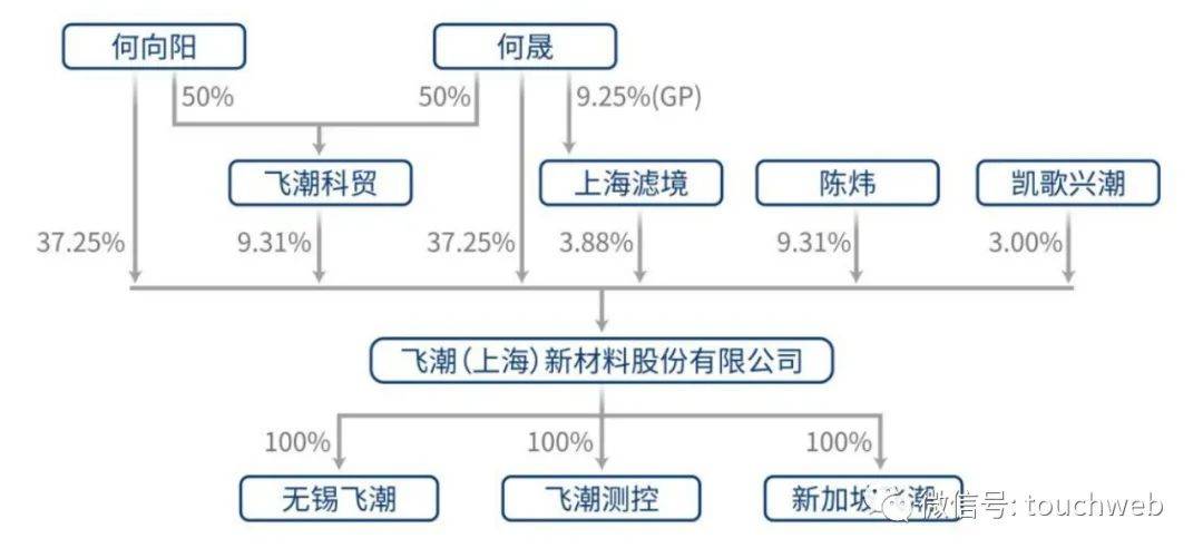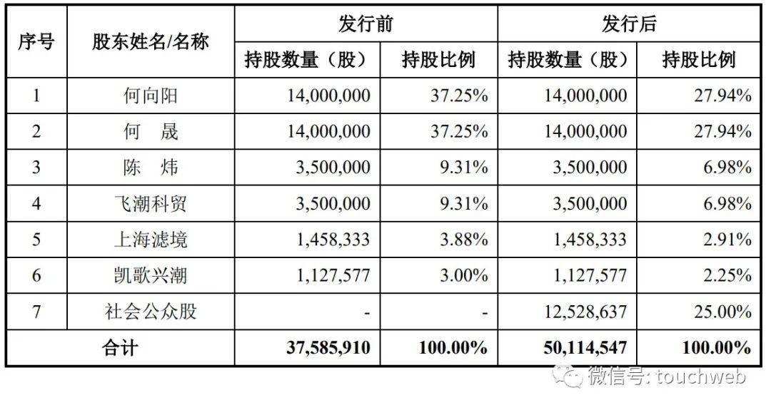 IPO后,何向阳、何晟分别持股为27.94%,陈炜、飞潮科贸分别持股为6.98%,上海滤境持股为2.91%,凯歌兴潮持股为2.25%。