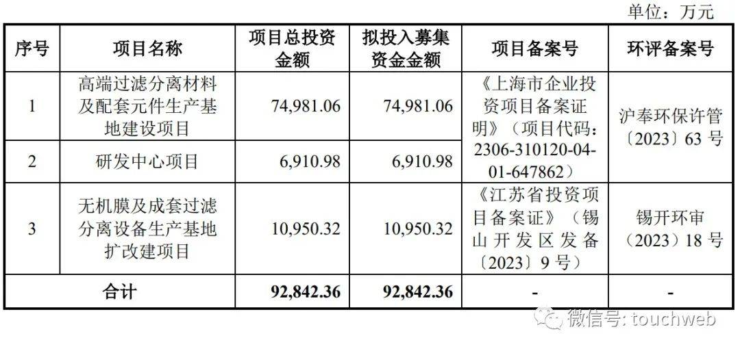 飞潮新材计划募资9.28亿元,其中,7.5亿元用于高端过滤分离材料及配套元件生产基地建设项目,6911万元用于研发中心项目,1.1亿元用于无机膜及成套过滤分离设备生产基地扩改建项目。