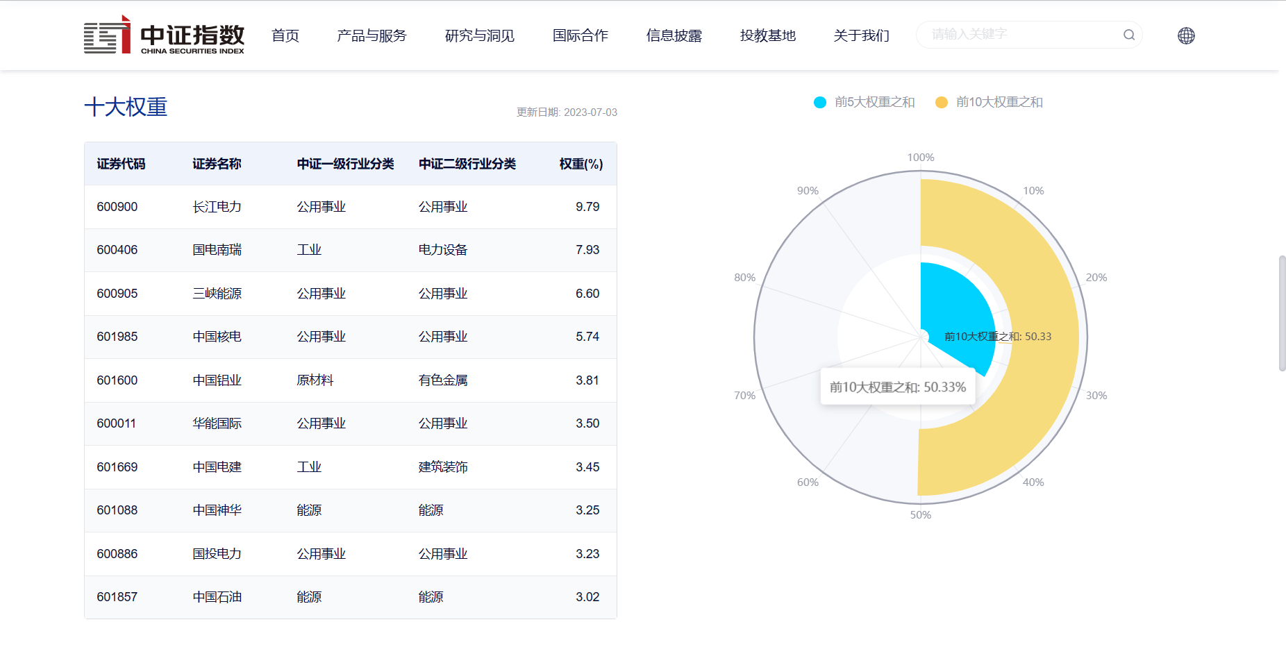 数据显示,截至2023年7月3日,中证国新央企现代能源指数前十大权重股分别为:长江电力、国电南瑞、三峡能源、中国核电、中国铝业、华能国际、中国电建、中国神华、国投电力、中国石油,权重合计占比达50.33%。