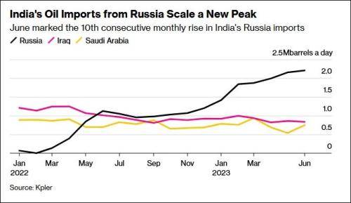 俄乌冲突爆发以来,印度成为俄罗斯石油的主要消费国之一,俄油所占进口份额不断攀升。分析公司Kpler的数据显示,6月印度自俄罗斯每日进口石油量增加到220万桶,连续10个月上升,超过了沙特阿拉伯和伊拉克的总出货量;截至5月,俄油占印度原油进口量的46%。