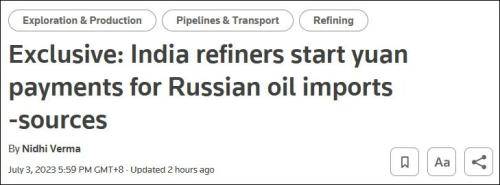 报道称,印度石油公司(IOC)是印度最大的俄罗斯原油买家,三名消息人士表示,该公司已在6月成为第一家以人民币支付部分俄油交易的国营炼油商。另两名消息人士称,印度三家私营炼油商中至少有两家也在用人民币支付部分从俄罗斯进口的原油。