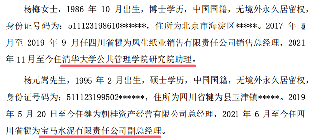 杨朝林女儿杨梅,2021年11月至今任清华大学公共管理学院研究院助理。儿子杨元嵩,2021年6月至今任四川省犍为宝马水泥有限责任公司副总经理。