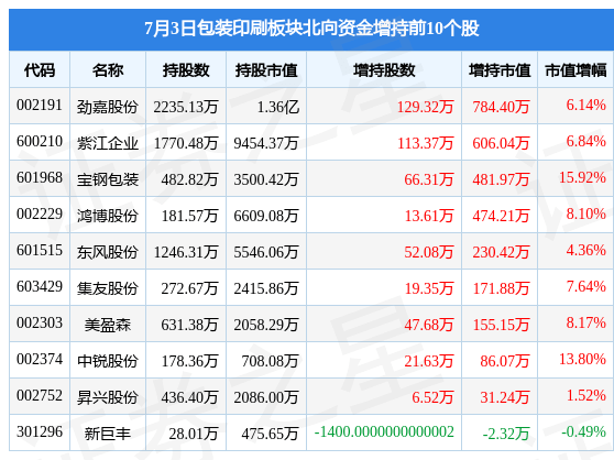 北向资金方面,当日包装印刷板块北向资金持股市值为24.14亿元,增持0.29亿元。其中增持最多的是劲嘉股份,增持了784.4万元。减持持最多的是奥瑞金,减持了113.92万元。包装印刷板块北向资金持股变动明细见下表: