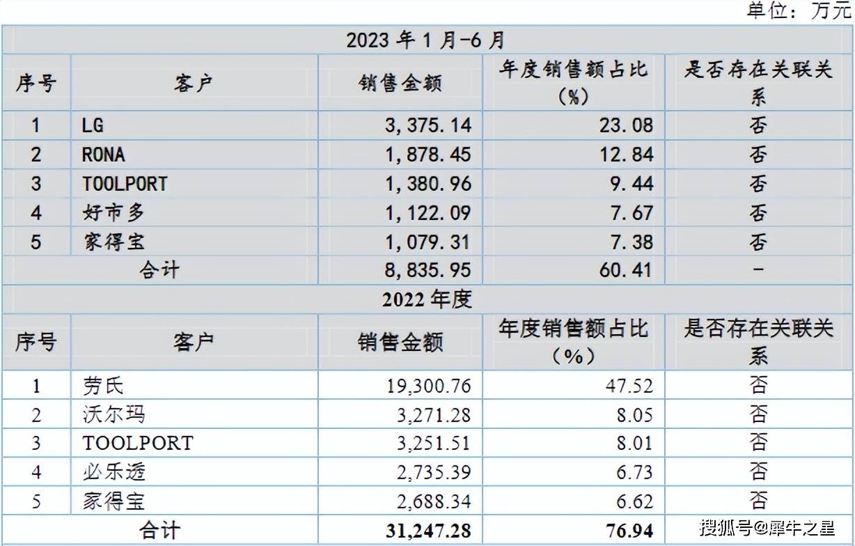 2020-2022年,公司合并口径前五大客户的总销售收入分别为2.13亿元、3.49亿元和3.12亿元,占当期主营业务收入的例分别为74.73%、74.46%及76.94%,客户集中度较高。