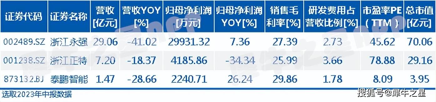 经过多年的发展,行业内形成了一批具有一定自主产品设计开发能力以及高效生产能力的大中型户外休闲家具及用品制造企业。从A股市场来看,目前尚没有与泰鹏智能完全对标的上市公司,产品业务较为相似的有浙江永强(002489)、浙江正特(001238)。