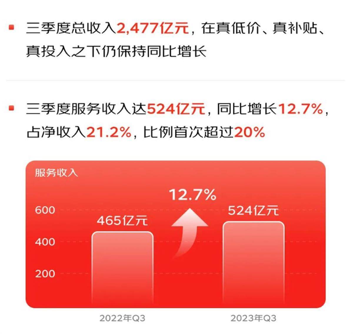 2023年三季度,京东集团收入达到2477亿元人民币(约340亿美元);作为核心品类的电子产品及家用电器继续保持收入同比增速高于行业平均水平;服务收入达到524亿元人民币(约72亿美元),占整体收入的比例首次超过20%,达到21.2%,其中物流及其他服务收入的同比增长19.3%。