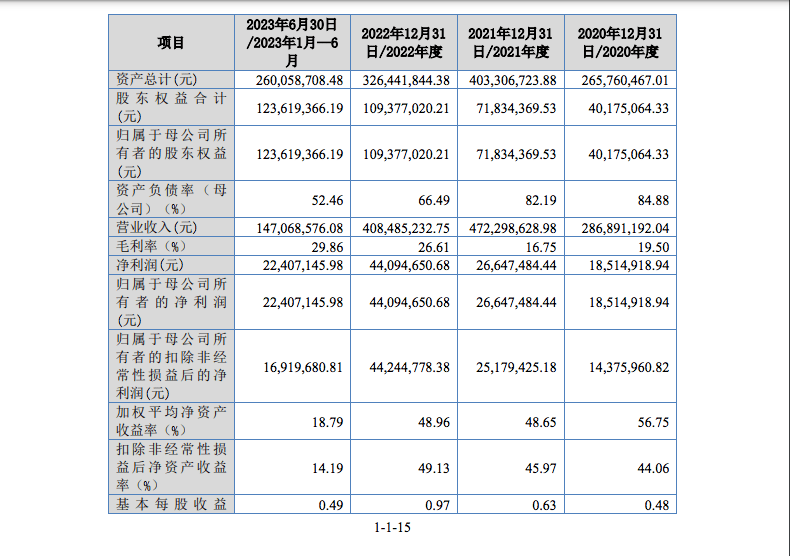 发行人 2021 年度、2022 年度营业收入分别为 47,229.86 万元、40,848.52 万 元,净利润分别为 2,517.94 万元、4,409.47 万元(扣除非经常性损益前后孰低值),加权平均净资产收益率分别为 45.97%、48.96%(以扣除非经常性损益前 后孰低值为计算依据)。 综上,根据《北京证券交易所股票上市规则(试行)》的相关规定,发行 人结合自身经营规模、盈利情况、以前年度股票交易情况等因素,选择具体的 上市标准为:预计市值不低于 2 亿元,最近两年净利润均不低于 1,500 万元且 加权平均净资产收益率平均不低于 8%,或者最近一年净利润不低于 2,500 万元 且加权平均净资产收益率不低于 8%。