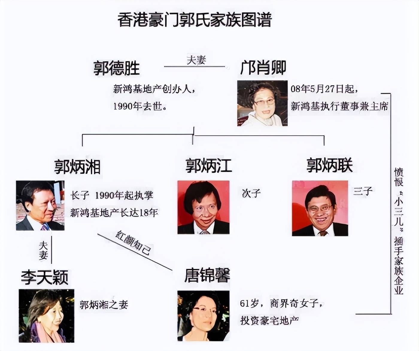 1990年,郭得胜去世,新鸿基地产以大儿子郭炳湘为首,其余地产业务和科技发展则由郭炳江和郭炳联两名胞弟协助打理。