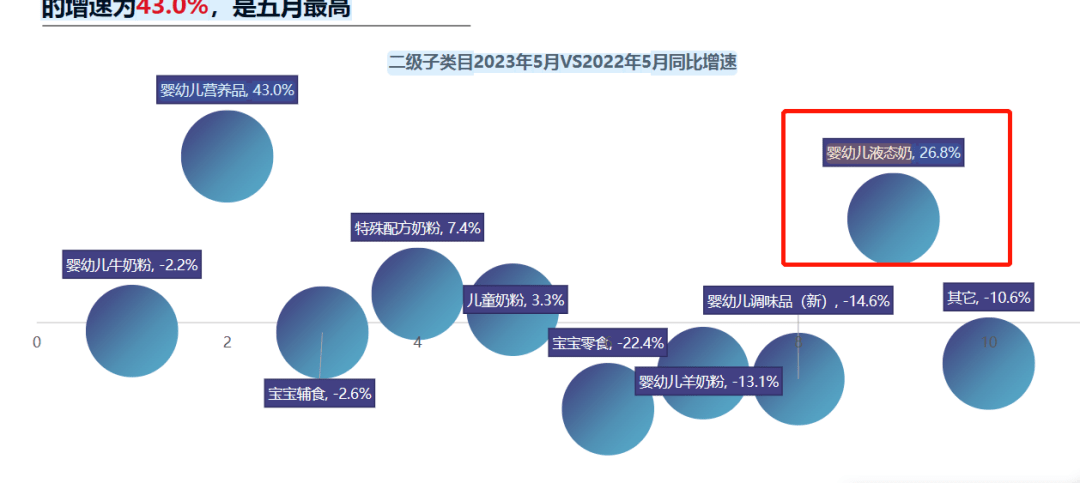 2023年解数咨询发布的母婴数据,婴配液态奶增速同比达到26.8%,仅次于婴幼儿营养品。而其他母婴细分品类增长数据来看,多数为负增长。