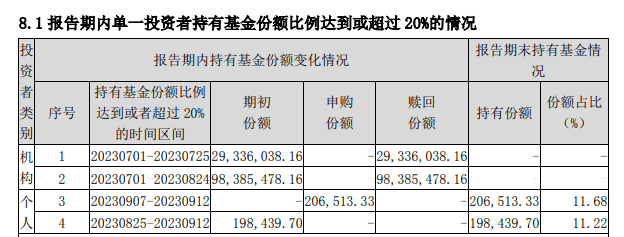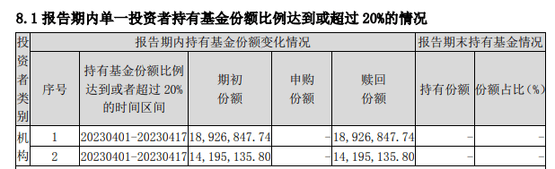 到了二季度末,一家机构赎回所持全部4699万份份额,另外两家机构持有份额合计为1.28亿份,合计占比仍高达99.53%。到了三季度末,前述两家机构也将所持份额全部赎回,这时基金总规模也跌至191.35万元,仅剩下两家机构持有份额在20万份左右。