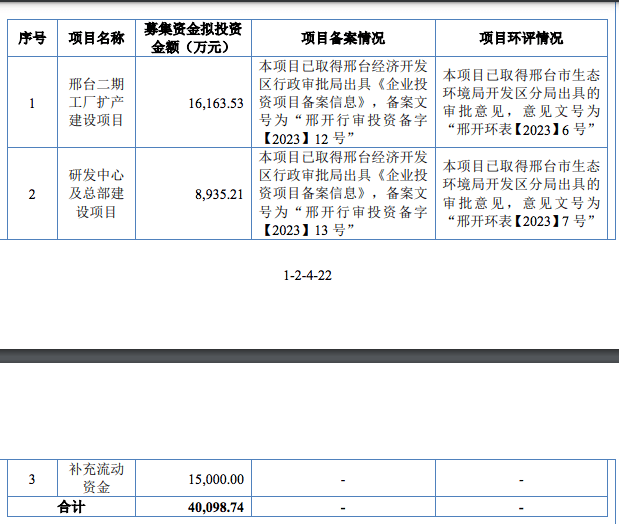 本次发行预计募集资金总额3.00亿元。若全额行使超额配售选择权本次募集资金总额为3.45亿元。募集资金主要投向邢台二期工厂扩产建设项目;补充流动资金;研发中心及总部建设项目。