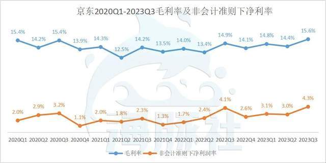 另一方面,从成本费用来看,百亿补贴等低价策略并没有影响京东的利润表现。Q3的毛利率为15.6%,非会计准则下的净利润率为4.3%,已经达到近三年最高。