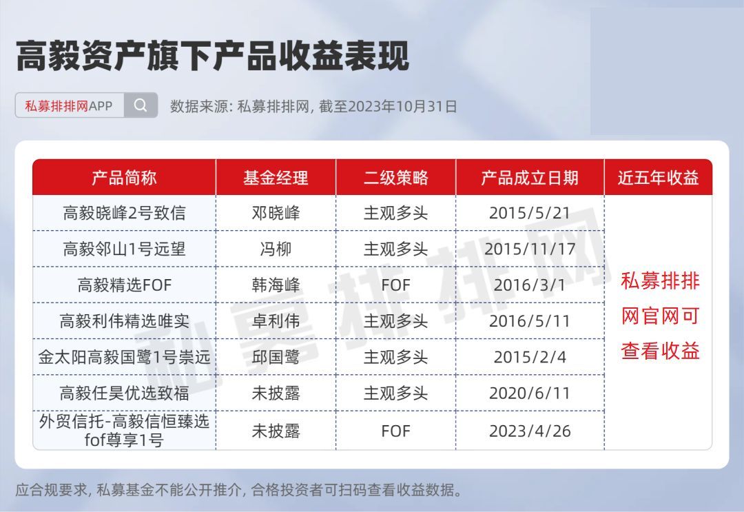 业绩方面,私募排排网数据显示,截至10月31日,高毅资产近五年收益为***%,跑赢同期沪深300指数。目前,高毅资产在私募排排网有业绩显示的基金产品共有7只,其中,邓晓峰管理的高毅晓峰2号致信近五年收益实现***。