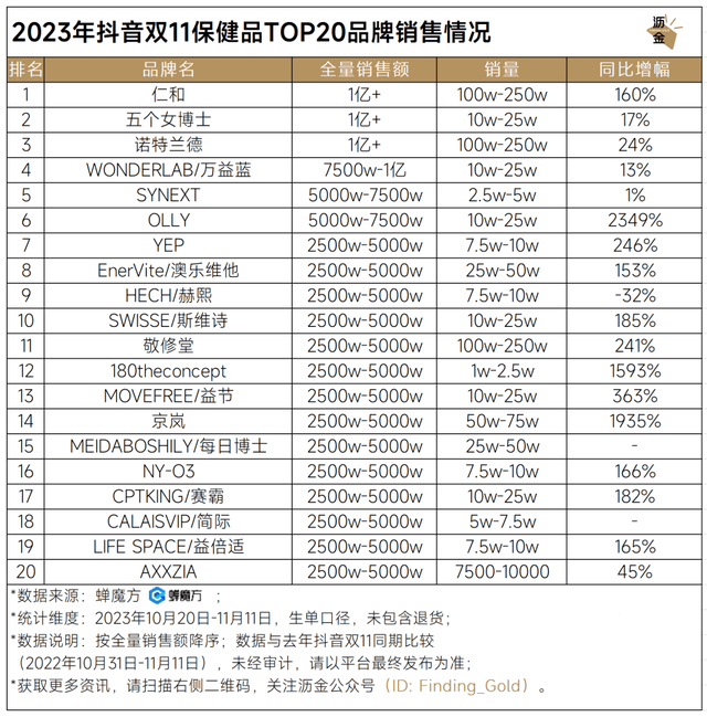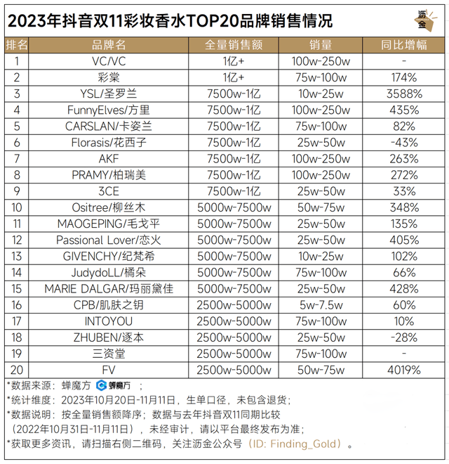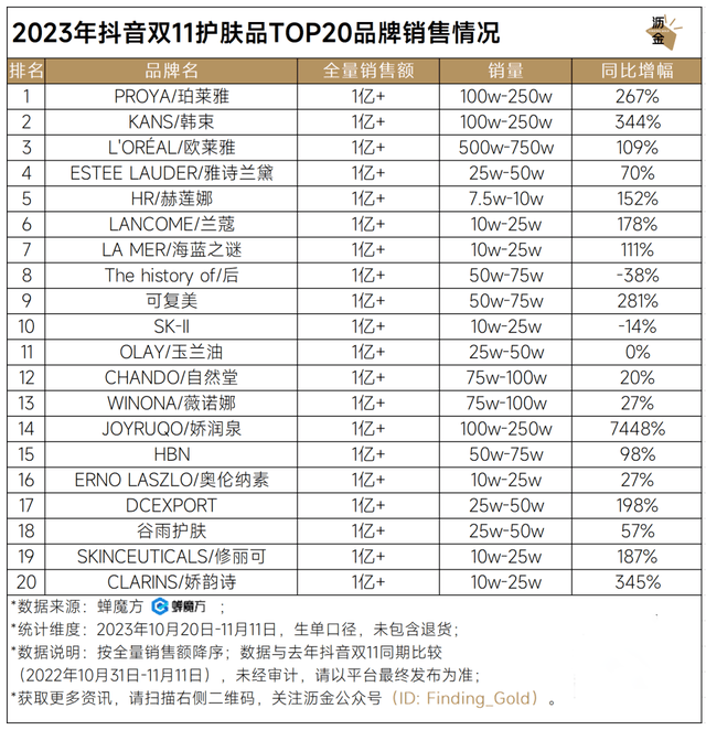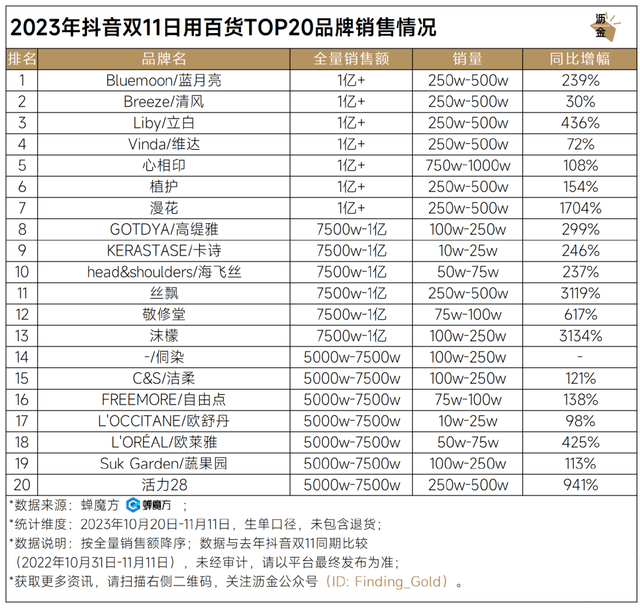 沥金联合蝉魔方对抖音双11的战绩(10月20日至11月11日)进行了抓取分析,以下为重点的110个二级类目的销售情况,18个重点类目的各类目TOP20品牌榜单及分析:
