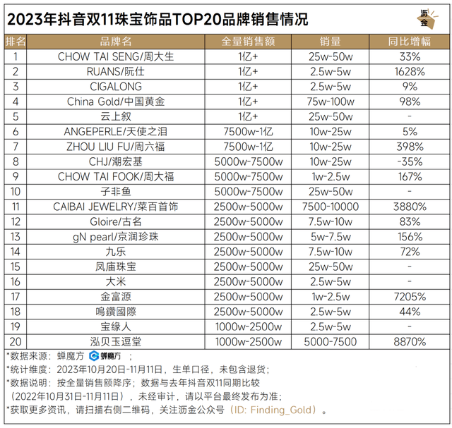今年黄金热、珍珠热的推波助澜下,抖音珠宝饰品类目的战绩也十分亮眼。珠宝饰品TOP20品牌榜中,周大生、阮仕、CIGALONG、中国黄金、云上叙全量销售额均破亿元,位列前四。