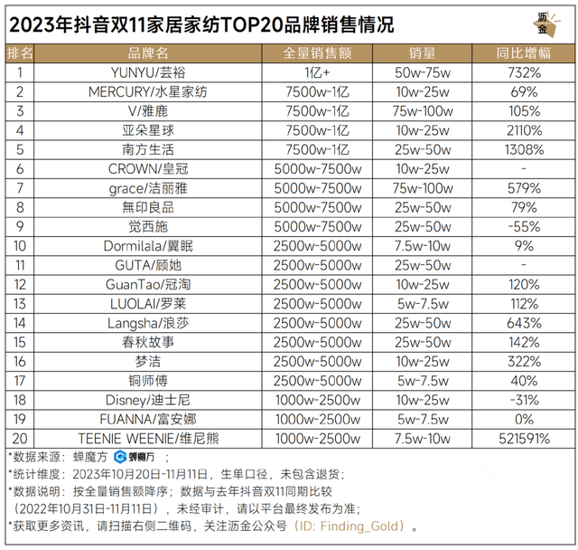 一生三分之一时间都会在床上度过,Z时代消费者也更会犒劳自己,今年抖音双11家居家纺TOP20品牌销售情况中,上榜品牌都贡献了过千万的全量销售额,中小品牌竞争较大,芸裕凭借“北欧轻奢风”的床品更是有1亿+销售额力夺魁首,其次是老牌国货水星家纺和有源头工厂价的雅鹿。