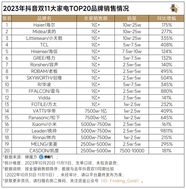 再看大家电类目,整个榜单几乎是国货品牌的天下,榜单前十三名都贡献了远超1亿+的全量销售额,由海尔、美的、小天鹅领跑类目。众多家电品牌依托全域兴趣电商优势,在抖音全域布局,着重内容场景和货架场景协同发力,在大促中取得好成绩。