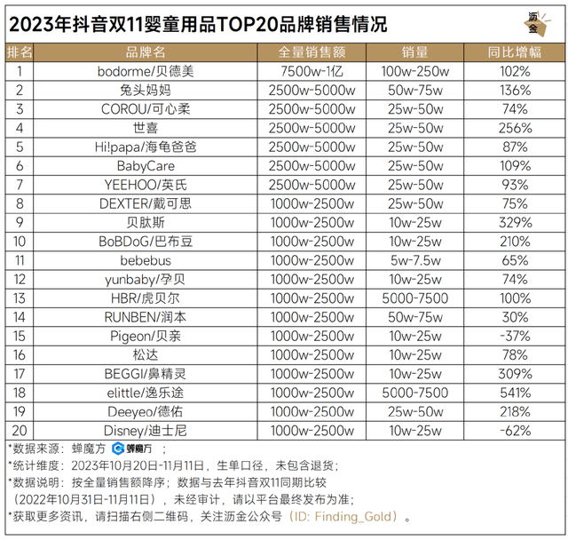 此次抖音双11婴童用品TOP20品牌榜单中,贝德美以近1亿的全量销售额、百万销量远超其他品牌,稳坐榜首;在抖音,婴童用品几乎是国货品牌的主场,且前三品牌都热卖婴幼儿洗护用品及日耗品,当代宝妈宝爸更注重儿童身体护理需求。