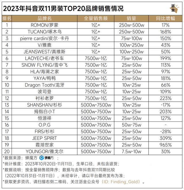 男装类目的TOP20品牌榜单与抖音双11预售内的品牌相差无几,罗蒙、啄木鸟、皮尔 · 卡丹、雅鹿、真维斯销售额均破亿,领跑类目榜单。
