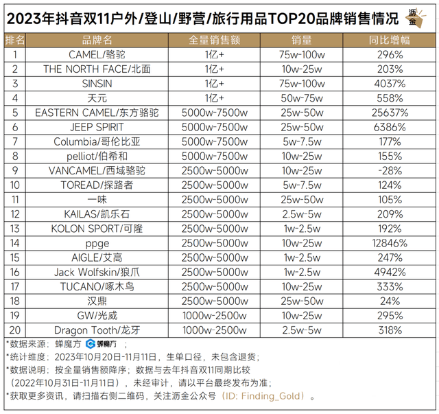 抖音双11户外/登山/野营/旅行用品TOP20品牌销售榜