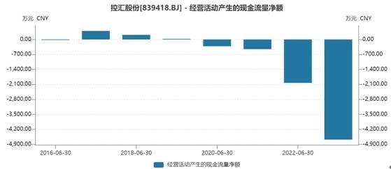 此外,需要注意的是,控汇股份目前的经营现金流也不太理想,从2020年6月30日至2023年6月30日期间,控汇股份中报的经营现金流净额均为负值,尤其是今年,现金流净额为-4679.88万元,同比增加133.82%。