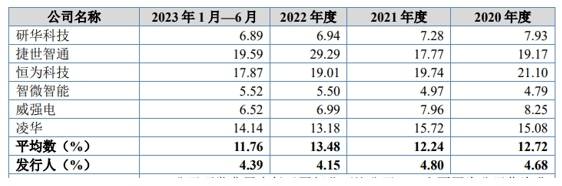 在毛利率方面,控汇股份同样要弱于同行,公司从2020年的30.88%到2023年6月,毛利率降到了28.56%,而同行公司持续在30%以上。