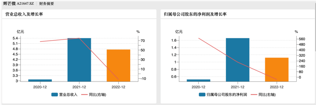 可以看出,经历了2020年和2021年的业绩快速增长后,2022年,辉芒微的营业收入和归母净利润均出现了不同程度的下滑。