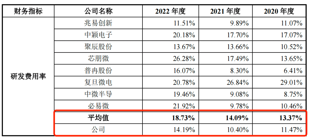 然而,辉芒微的同行业可比上市公司的研发费用率平均值分别为13.37%、14.09%和18.73%,辉芒微的研发费用率明显低于同行公司。