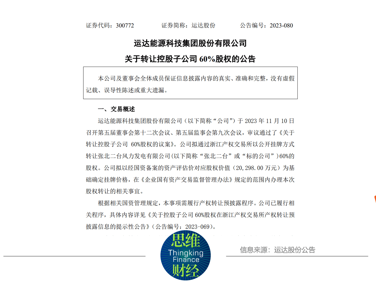 根据公告显示,运达股份拟通过浙江产权交易所以公开挂牌方式转让张北二台风力发电有限公司60%的股权。拟以经国资备案的资产评估价对应股权价值(20,298.00 万元)为基础确定挂牌价格,在《企业国有资产交易监督管理办法》规定的范围内办理本次股权转让的相关事宜。