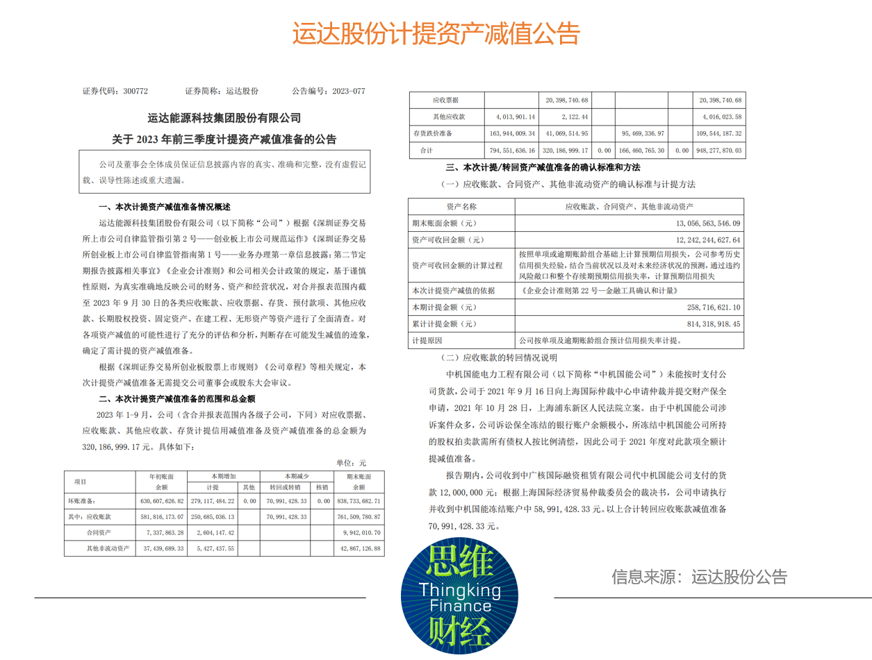 今年前三季度,运达股份对应收票据、应收账款、其他应收款、存货计提信用减值准备及资产减值准备的总金额为3.2亿元,转回信用减值准备7099.14万元,转销资产减值准备9546.93万元,减少公司报告期净利润1.28亿元。